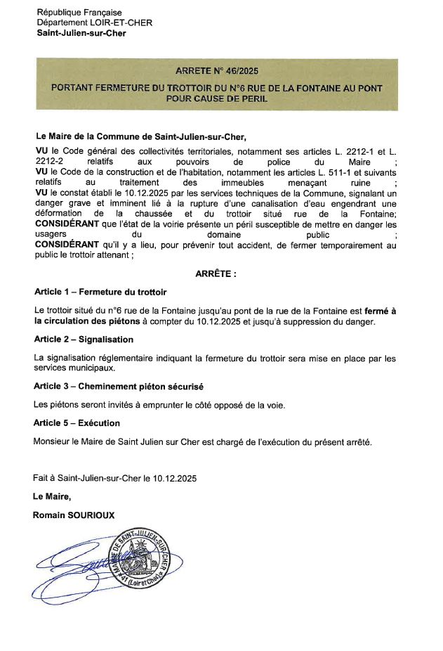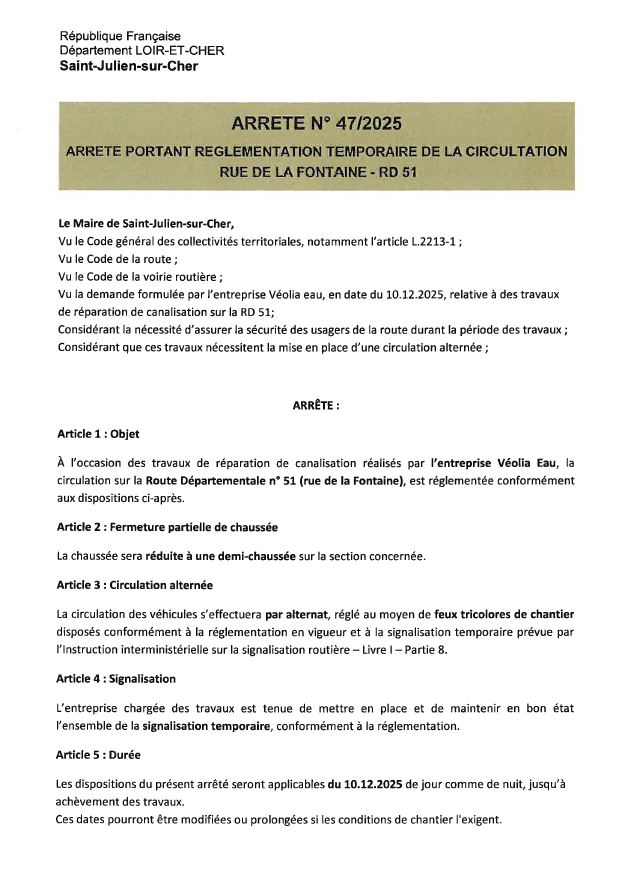à l’arrêté n°47/2025. La route sera ouverte sur demie chaussée au cours de l’après-midi ou soirée selon l’avancée des travaux.